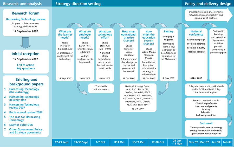 Harnessing Technology: Learning in the 21st Century, a Call to Action [8 pages, 3 MB PDF] - has just been published by Becta as the introduction for a series of policy seminars concerning the e-learning strategy. These take place between September and November 2007, and they lead up to a National Conference to be run by Becta on 6 November (election, if called, permitting). Click on the thumbnail image above to see the timetable, process, and some of the people involved.